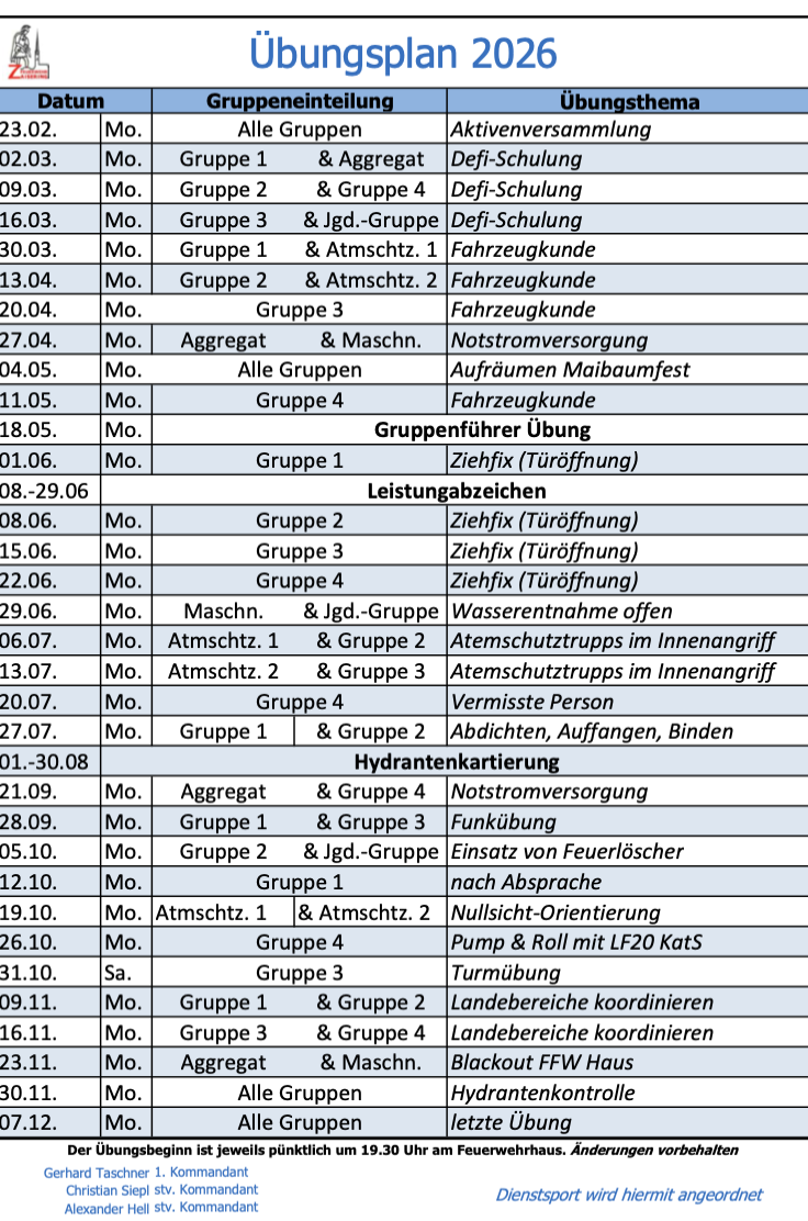 Liebe aktive Mitglieder, auf dieser Seite findet ihr den aktuellen Übungsplan 2026 zum Download.